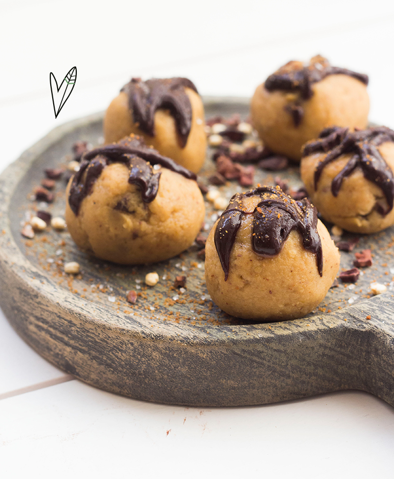 ¡Estas bolitas son adictivamente deliciosas! ¿También querías siempre lamer el tazón en el pasado cuando estabas haciendo galletas? En secreto, la masa era incluso más rica que las galletas mismas… Pues, ¡estas son esas bolitas! Pero sin peligro de salmonela, ya que no llevan huevo.