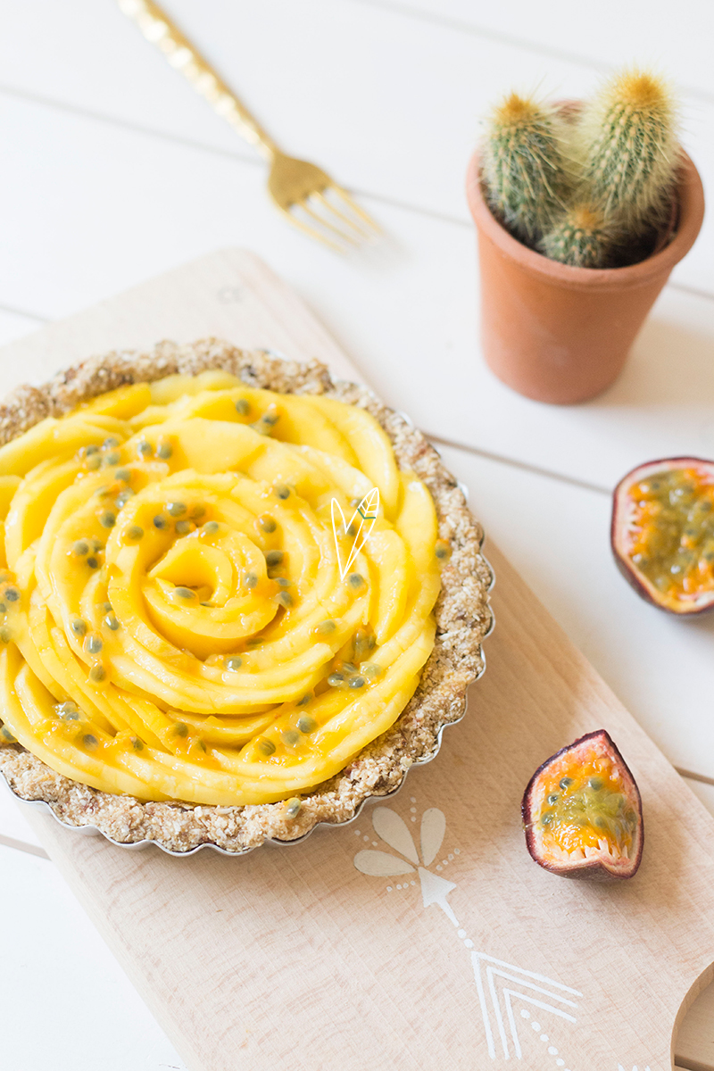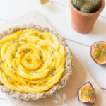 4. Schuif een spatel onder de roos om deze in de taartvorm te leggen. Besprenkel met de passievrucht pitjes en serveer. Enjoy!