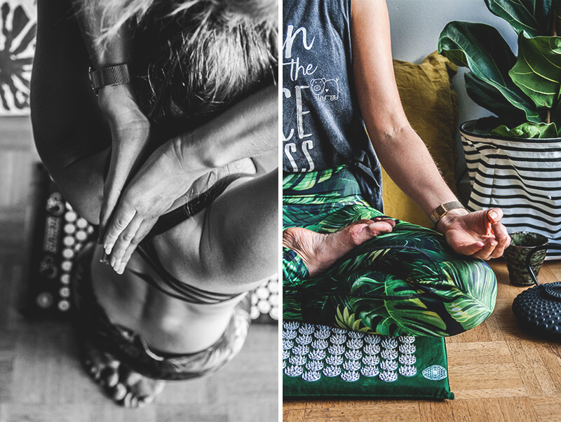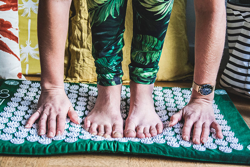 You can lie on the mat with, for example, a towel around your body or with your bare skin. There are different positions you can assume. For instance, you can sit on a chair and place your feet on the mat, moving them slowly. But you can also lay the mat on the floor or on your bed and lie on it with your back or stomach. Additionally, there are plenty of yoga poses you can practice on the mat. Initially, it might be quite painful, but soon the pain should give way to a warm, tingling, and relaxed feeling.